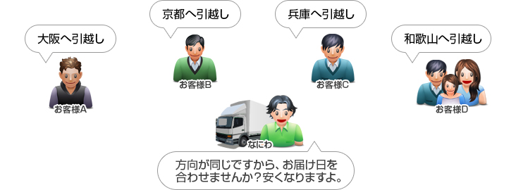 (たとえば)、関西方面へ引越したいお客様Aさんと、同じく関西方面に引越したいお客様Bさんがいたとします。お荷物の引取り日やお届け日をお2人とご相談させていただいて、日程が合いましたらAさん、Bさんのお荷物を同じトラックで一緒にお運びしてしまうのが、長距離混載便です。