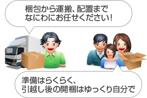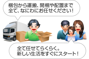 こちらのプランは、引越前のお荷物の梱包から、新居での家具・家電の配置、 お荷物の解梱まで全てお任せいただくプランになっております。